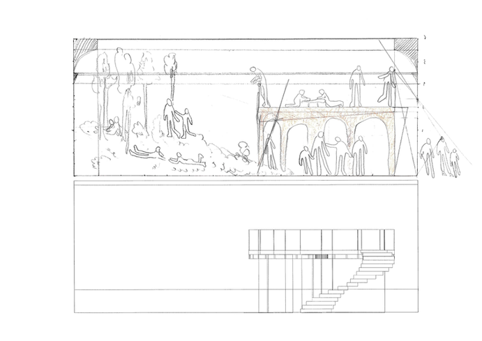 By creating a pavilion with accessible roof top, I wanted to achieve exactly this. Suddenly the Langaard hall would not seem so tall and and dominating. Suddenly you are not looking up anymore to the cornice where it said Christian Langaard Gave in golden letters. Instead, you stand on eye hight with it. It is a matter of perspective.