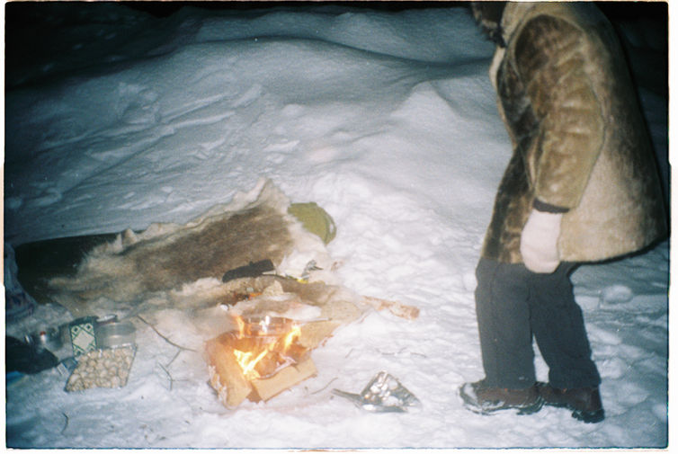 In Kárášjohka we slept in a wonderful forest, sat on reindeer pelts around the bonfire and saw the Northern lights dancing through the cold night. 27 degrees beneath zero. I tried to spot Sarvvis, the great reindeer in the sky, but I did not find it. Sarvvis is running from Fávdna, persistent hunter holding bow and arrow. However, Fávdna is not alone on the hunt: A couple on skis and their dogs are also crossing the night sky. Among others, Boahji, the Pole star, is as well aiming his bow towards Sarvvis. If he shoots all stars will fall from the sky and it will be the end of the world. After hours of suspense, the sun rises and the hunt is over for the night.